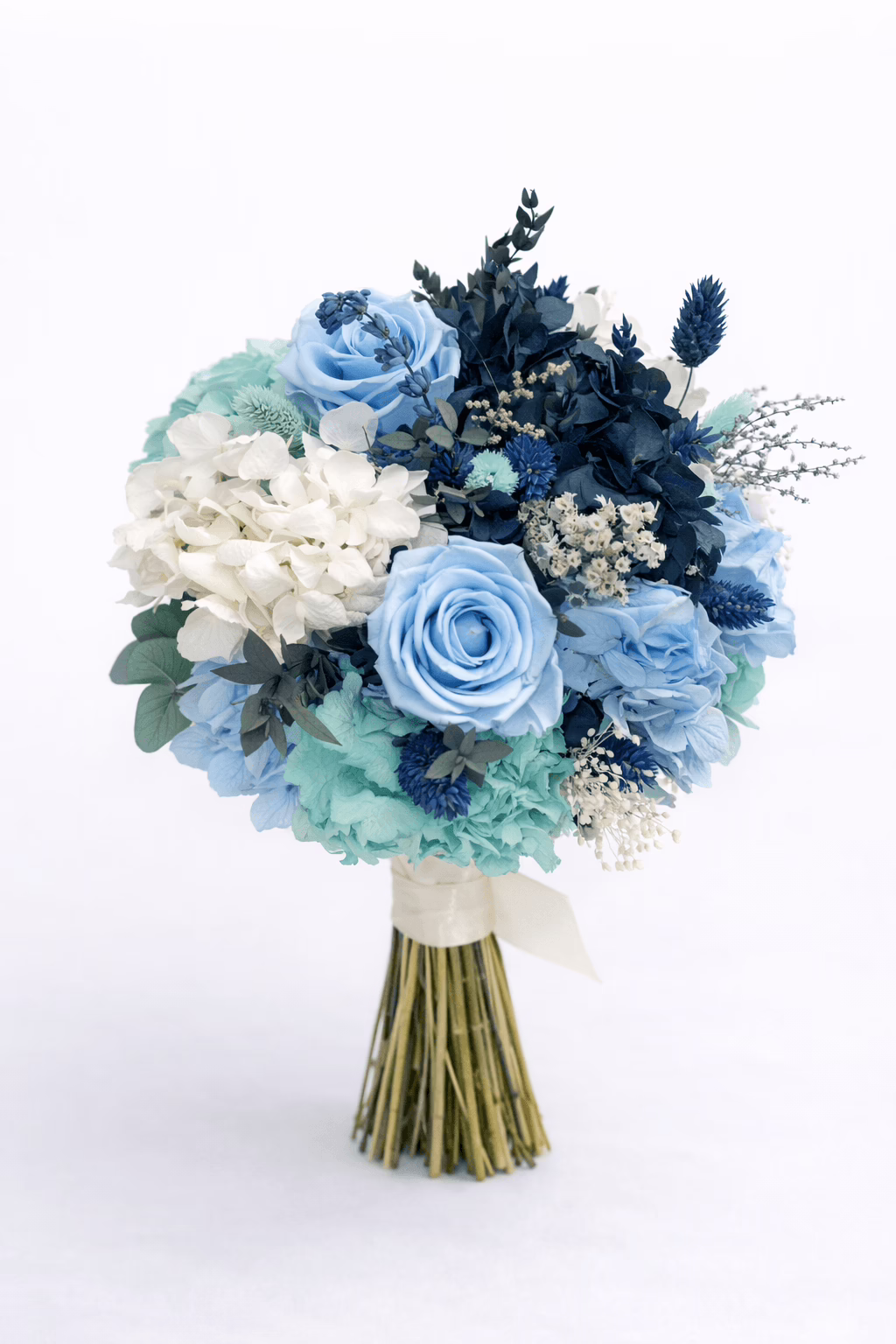 Blue es un ramo de novia preservado en una armoniosa gama de azules y verdes suaves, combinado con toques blancos que aportan luz y equilibrio. Sus rosas celestes y hortensias crean una composición sofisticada y fresca, con un estilo romántico y actual.