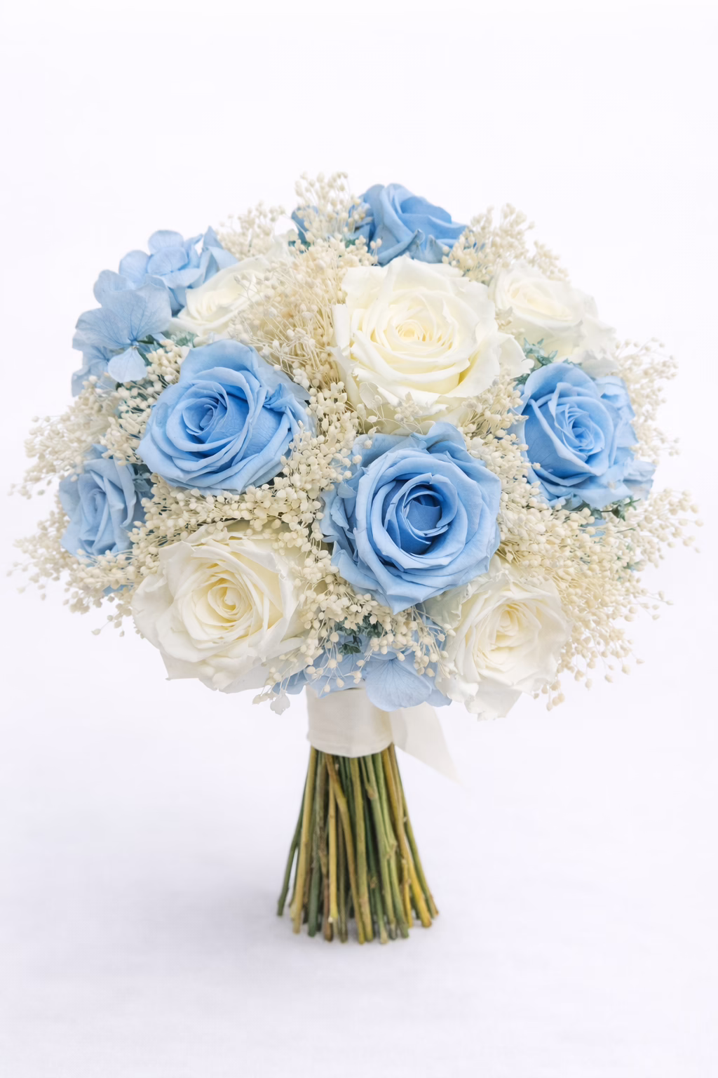 Ramo de novia preservado en suaves tonos azul cielo y blancos, que transmite delicadeza y elegancia. Las rosas combinadas con paniculata crean una composición armónica fresca y muy romántica .