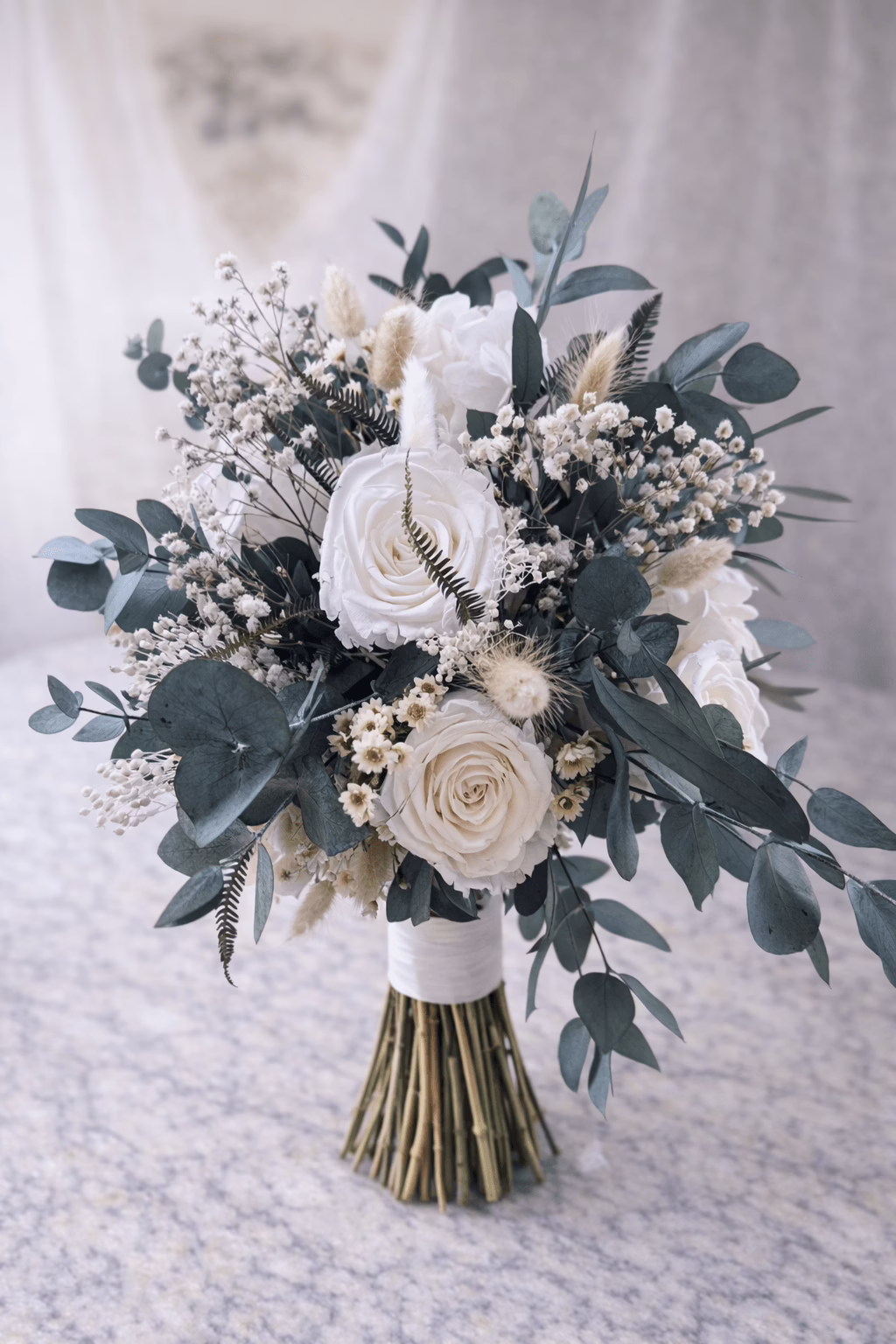 Ramo de Novia preservado en tonos blancos y verdes de estilo natural y sofisticado. Destacan sus rosa blancas combinadas con paniculata ,eucalipto, y delicadas flores secas, creando un equilibrio perfecto entre frescura y elegancia. Su diseño armonioso y atemporal lo convierte en una opción ideal para novias que buscan un ramo clásico con un aire moderno.