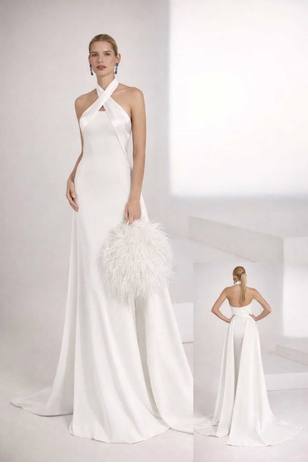 Vestido de novia semi sirena de escote halter cruzado que estiliza el cuello y dibuja la silueta, su caída fluida y espalda descubierta crean un look moderno, sofisticado y muy favorecedor.