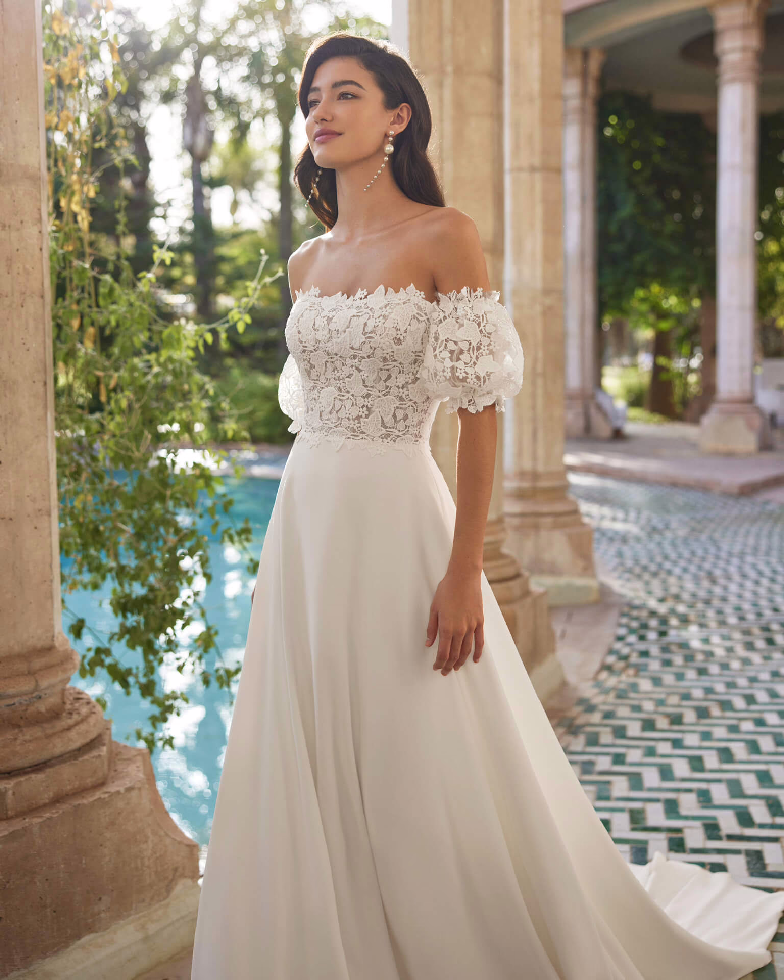 Vestido de novia de corte A y estilo romántico , elaborado con encaje Guipur y falda de crepe luce un escote palabra de honor y manguitos extraíbles. Disponible en talla 36