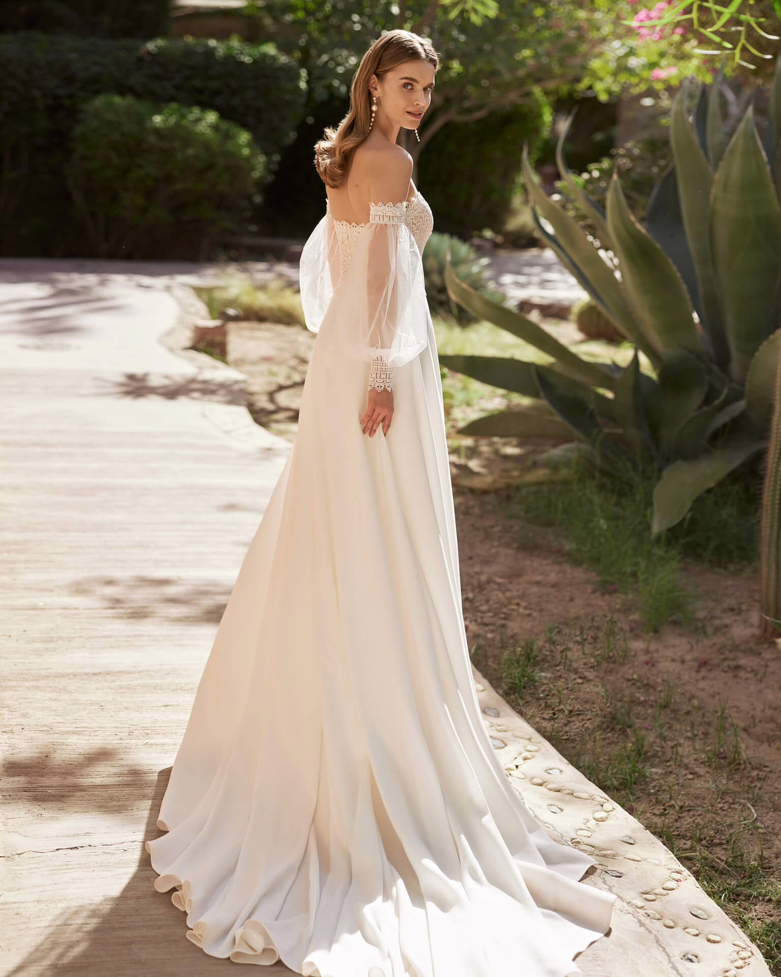 Vestido de Novia de estilo Boho Chic, confeccionado en crepe y encaje, cuenta con mangas abullonadas extraíbles y está disponible en talla 42