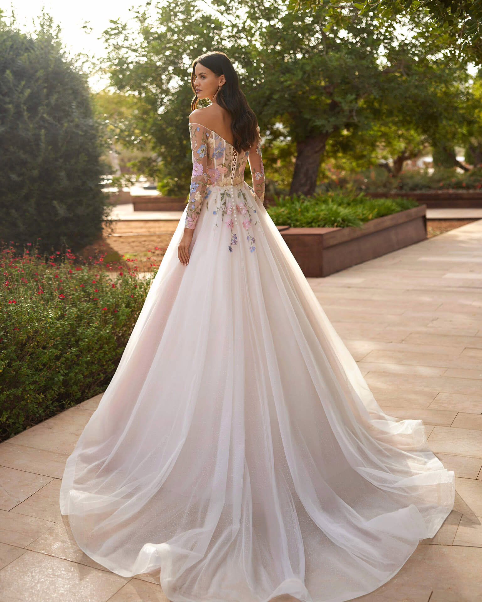 Vestido de novia de corte princesa, con voluminosa falda de tul, cuerpo de encaje y pedrería, escote palabra de honor, manga larga y espalda corsé.